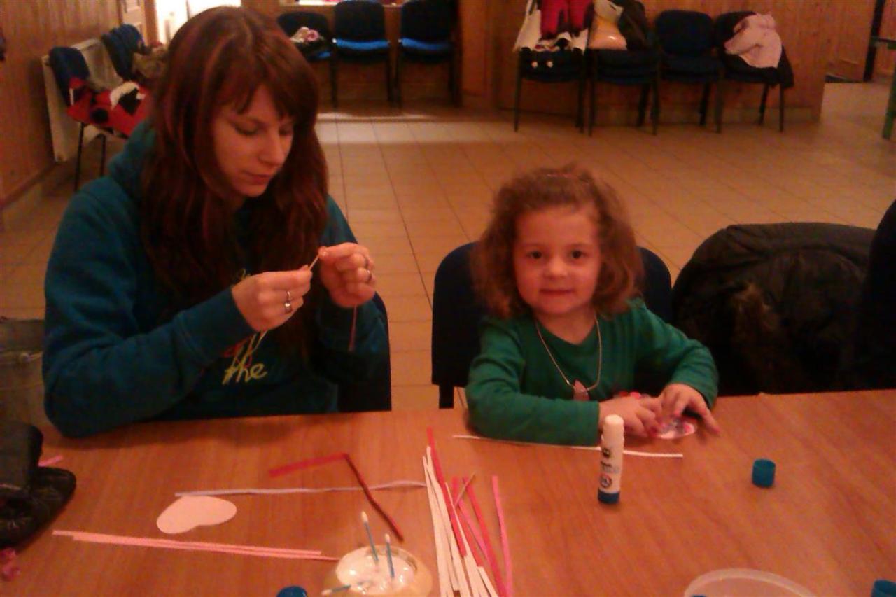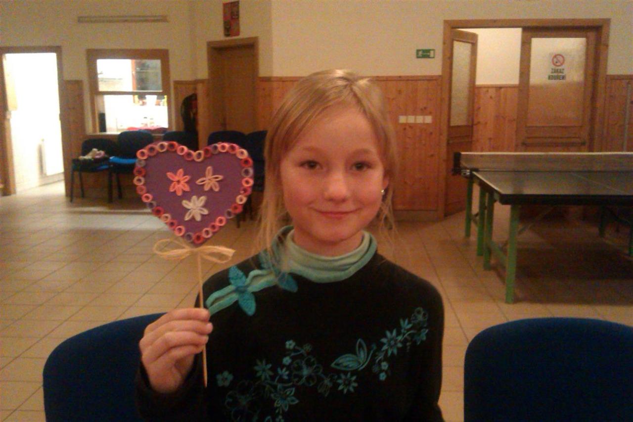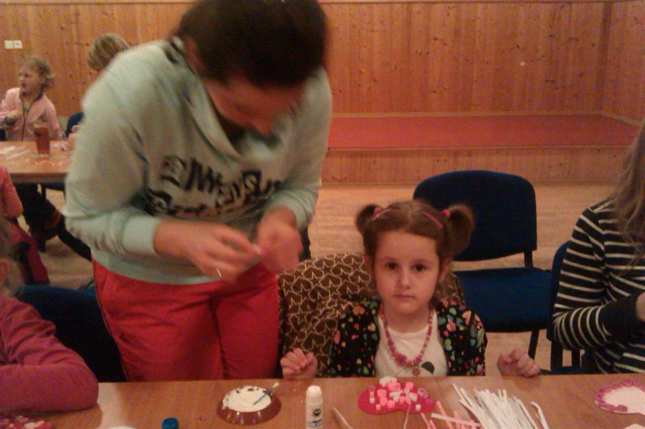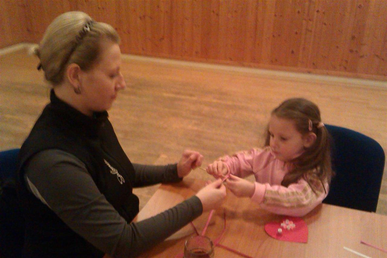 V úterý 11.02.2014 jsme se opět sešli v sále, tentokrát za účelem vyrobení dárečku pro někoho milého ke svátku sv. Valentýna. Lektorka paní Lebedová pro nás připravila papírová srdíčka různých velikostí, na která jsme nalepovali papírové "šneky". Šneky jsme si vyráběli sami z proužků barevných papírů. Každý si vytvořil srdíčko dle své fantazie. Strávili jsme příjemné dvě hodiny nejen tvořením, ale i povídáním a děvčata nám při práci i krásně zazpívala. Troufám si tvrdit, že bylo spokojeno jak 21 dětí, tak i maminky těch nejmladších, které přišly svým dětem s výrobou pomoci. Už se těšíme na březnové tvoření :-)